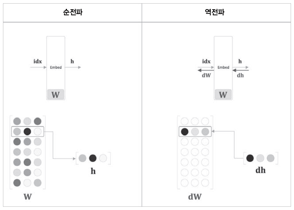 embedding layer에서 계층의 순전파는 특정 행을 추출하여 흘려보내는 것이었다. 따라서 역전파에서는 <그림4>에서처럼 앞 층(출력 쪽)으로부터 전해진 기울기를 다음 층(입력 쪽)으로 흘려보내기만 하면 된다.