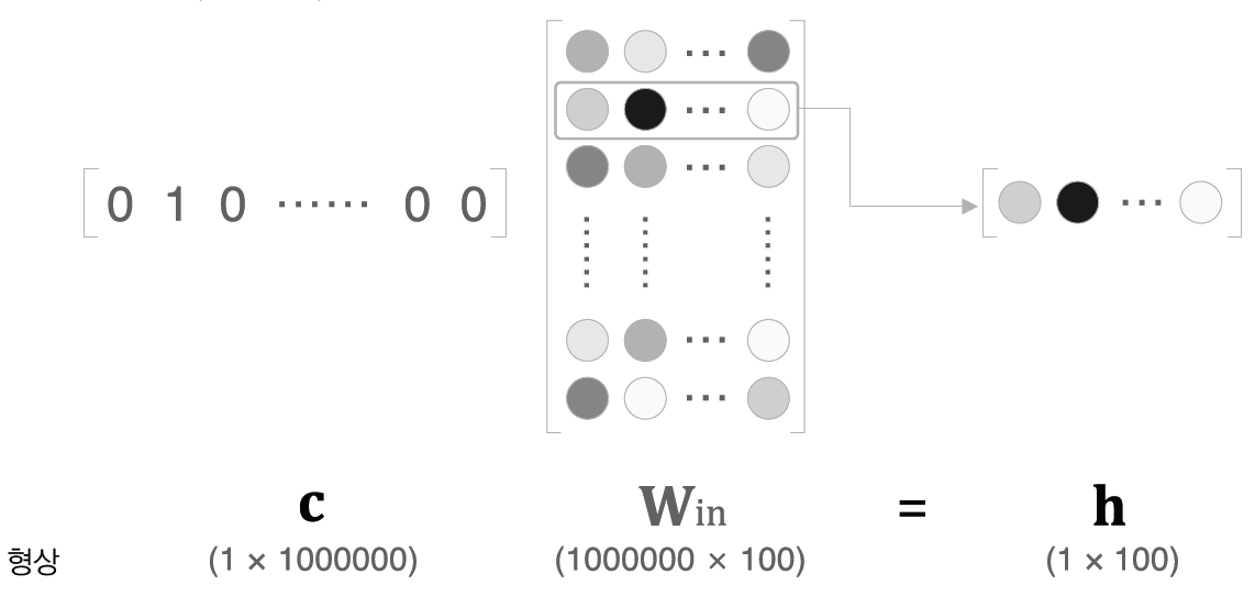 그런데, 이 연산은 input의 특성을 생각해보면 매우 비효율적인 연산이다. 왜냐하면 input은 항상 하나의 값만이 1인 one-hot표현이기 때문에 이 벡터와 Win과의 행렬곱은 Win의 한 행벡터를 뽑아내는 연산이 되기 때문이다. 따라서 행렬곱 계층을 '단어 ID에 해당하는 행(벡터)'을 추출하는 계층으로 바꾼다면 이 계산 과정이 개선될 것이다. 이 계산을 수행하는 계층을 Embedding layer라 한다.