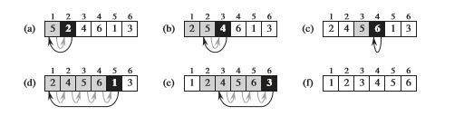 예를들어 1 4 9 12로 이미 정렬된 배열이 있고 10을 넣는 상황을 생각해보자. 그럼 12부터 보면 된다. 12보다는 10이 작으니까 그 이전 수를 보면 9다. 그럼 10을 그 뒤에 "삽입"하고 12를 10의 뒤로 밀면 1 4 9 10 12가 된다. 이런 것을 j=from 2 to n 반복하면 된다. <그림1>은 그런 반복적인 삽입 방법을 설명한다.