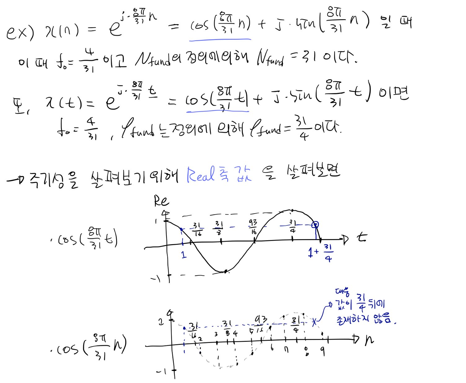 이 때 fundamental period는 smallest positive T이며 수학적으로 밑과 같이 쓸수있다. 추가적으로 이 fundamental period에 대응하는 fundamental frequency도 정의할 수 있다.