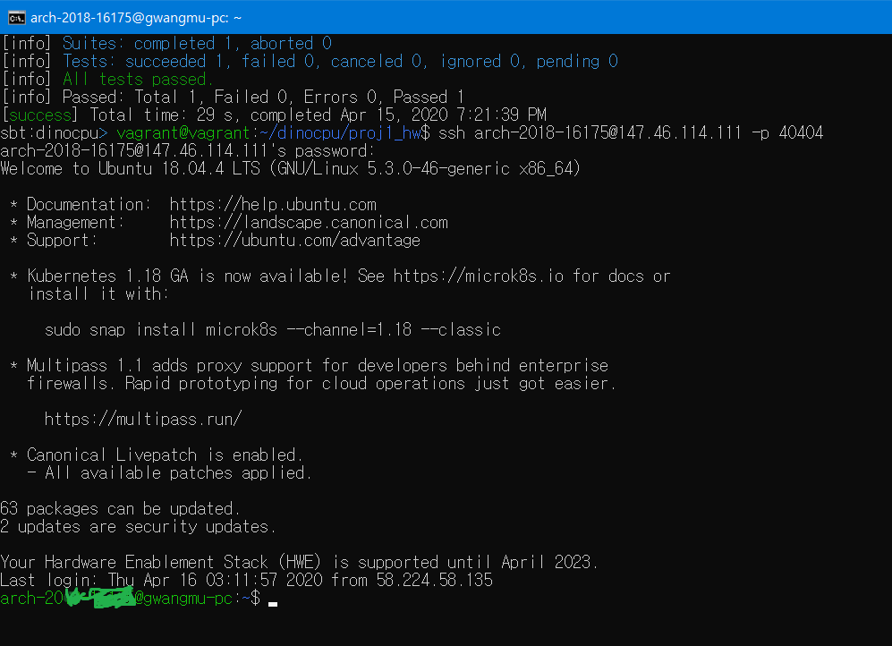 이제, 제출이 제대로 되었는지 확인해보기 위해 해당 서버에 직접 접속해서 조교들이 마련한 테스트 프로그램을 돌려보자. 현재 접속한 vagrant 환경은 linux환경이기 때문에 다음과 같은 ssh 커맨드를 입력하여 다른 서버에 접속할 수 있다. 학번이 2020-12345인 경우는 다음과 같이 입력하면 된다.