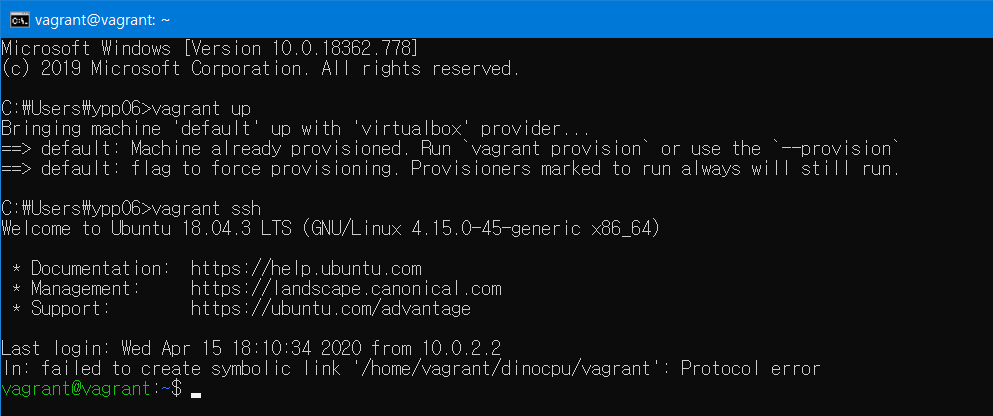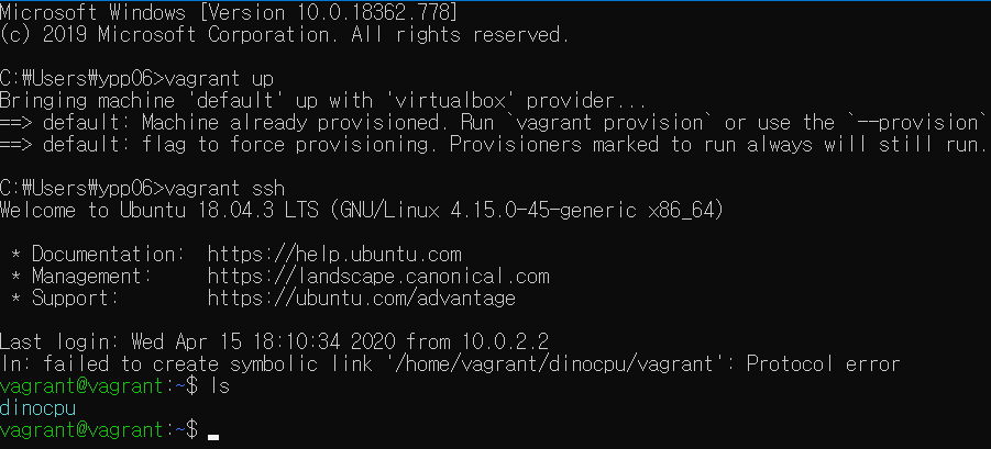 이전에 dinocpu를 등록했던 환경에서(vagrant init dinocpu 커맨드를 입력해 dinocpu 파일이 있는 directory) 커맨드 창을 열고