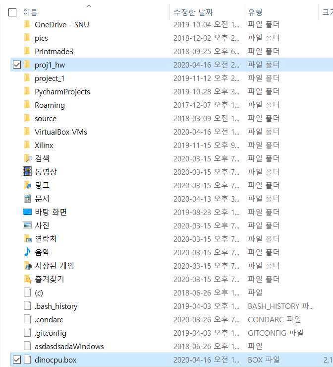 그렇게 내용물을 풀어놓고 dinocpu에서 ls를 입력하면 다음 <그림5>와 같이 proj1_hw가 잘 있는 것을 확인해볼 수 있다.