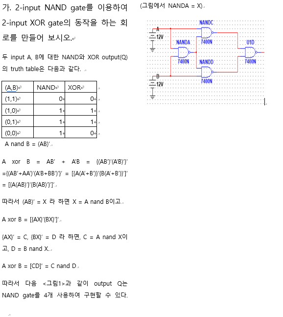 이런 경우 아까 말했듯이 perceptron을 층층이 쌓은 multi-layer perceptron을 사용하면 XOR같은 복잡한 논리도 구현할 수 있다. 논리회로에서도 동일한 방법으로 이를 구현하는데, 실제로 밑의 <그림3>의 '가' 항목은 필자의 논리회로 수업 때 예비보고서에 적어야 할 사항이었는데, NAND만을 이용해 XOR을 구현하는 문제였다. (논리회로에서는 NAND가 AND보다 만들기 쉽다.)